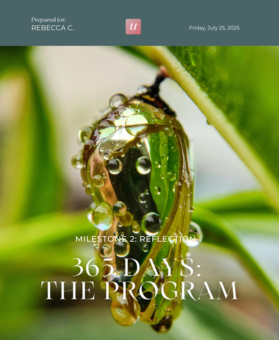 Each participant moves through twelve months of structured milestones — guided reflection, live conversation, and personalized written feedback authored directly by Lindsay.